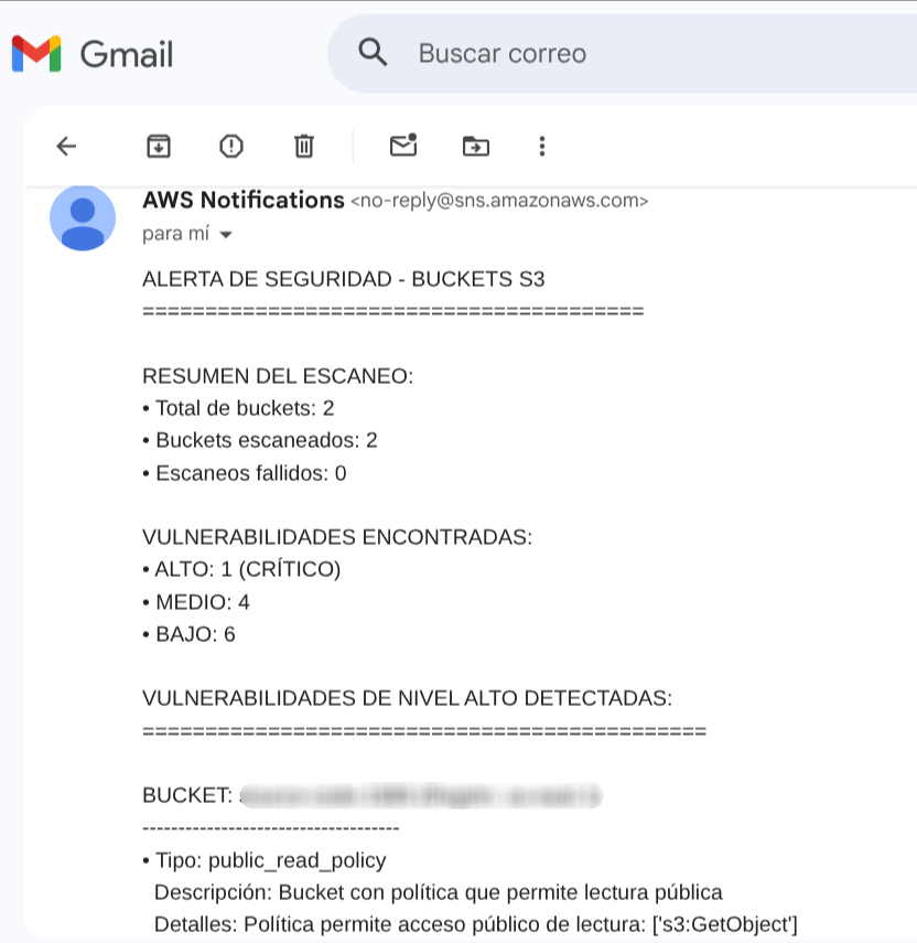 Notificaciones SNS (5, 6): Si el análisis de seguridad detecta una o más vulnerabilidades de nivel ALTO, se envía automáticamente una notificación SNS (Simple Notification Service) por correo electrónico, la cual incluye información detallada sobre el hallazgo.