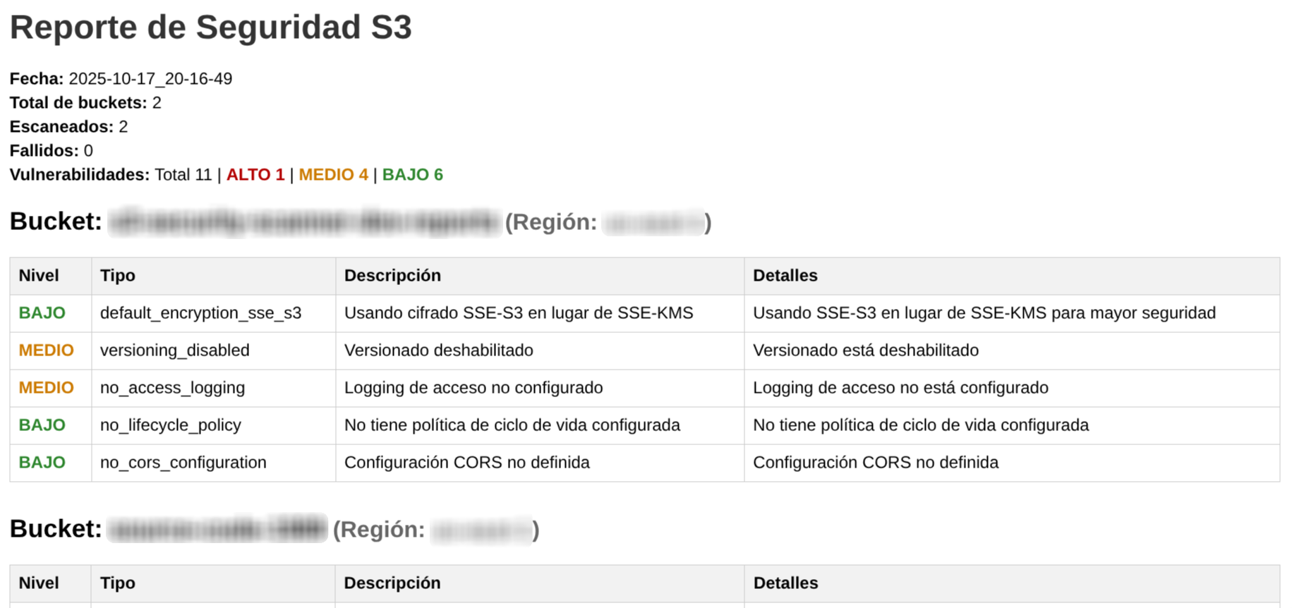 Este proyecto consiste en una herramienta de escaneo de seguridad para buckets de Amazon S3, desarrollada con Python y la biblioteca Boto3. La herramienta permite a los usuarios identificar configuraciones de seguridad potencialmente riesgosas, generando además un informe detallado de los hallazgos en diferentes formatos para su análisis posterior.