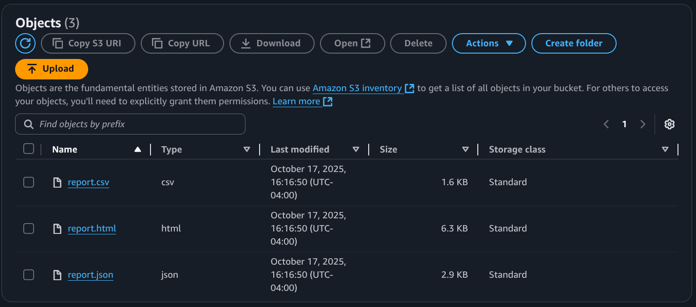 Almacenamiento de informes en S3 (4): Tras completar su ejecución, la función Lambda clasifica los hallazgos de seguridad en tres niveles: ALTO, MEDIO y BAJO. Posteriormente, almacena los reportes en un bucket S3 para su análisis, usando tres formatos: CSV, JSON y HTML.