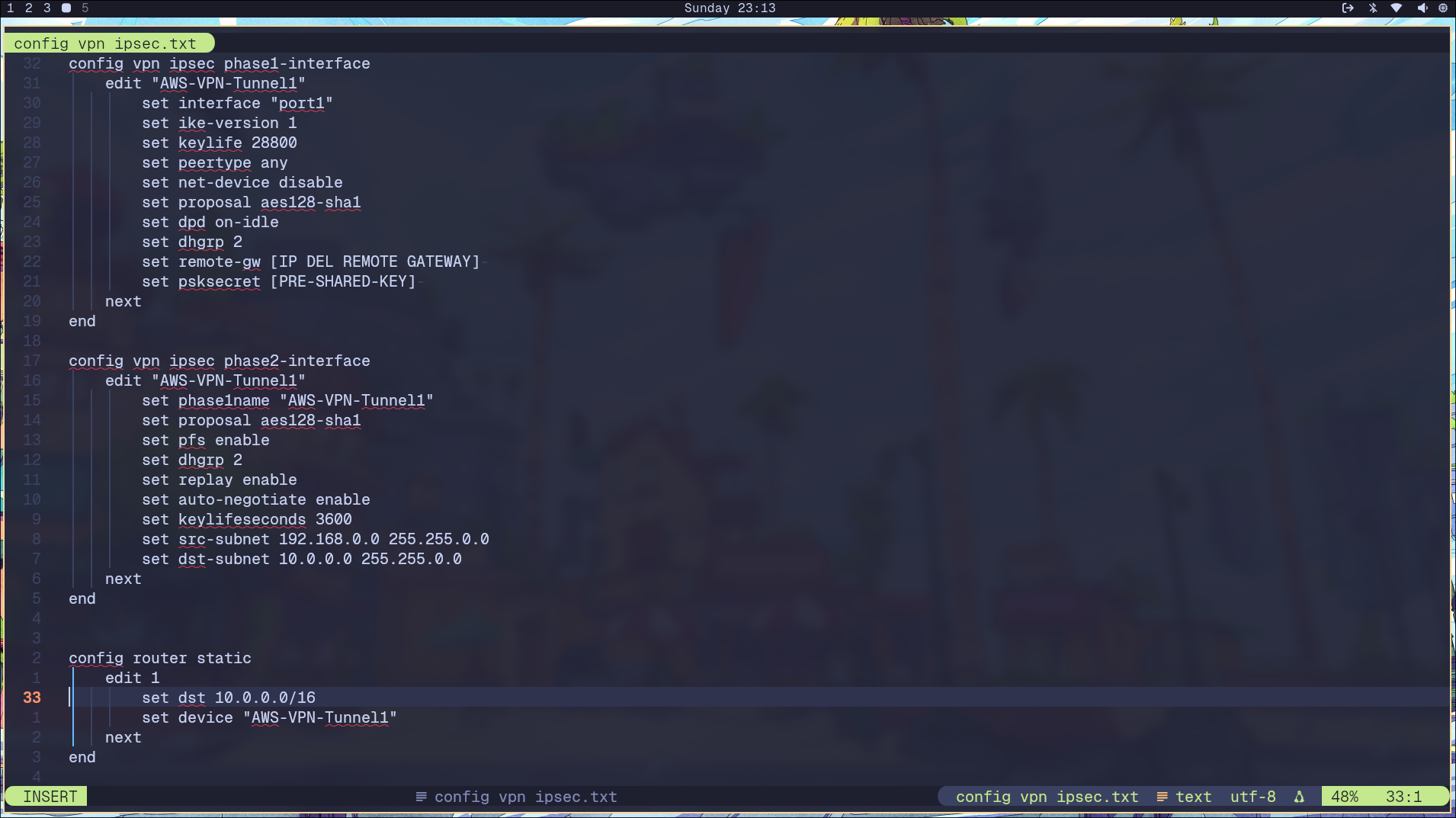 El archivo descargado contiene todos los parámetros necesarios para establecer el túnel VPN en FortiGate incluyendo las claves pre-compartidas, las políticas de seguridad y las rutas estáticas.